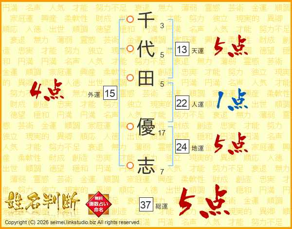 千(3画)代(5画)田(5画) 優(17画)志(7画)