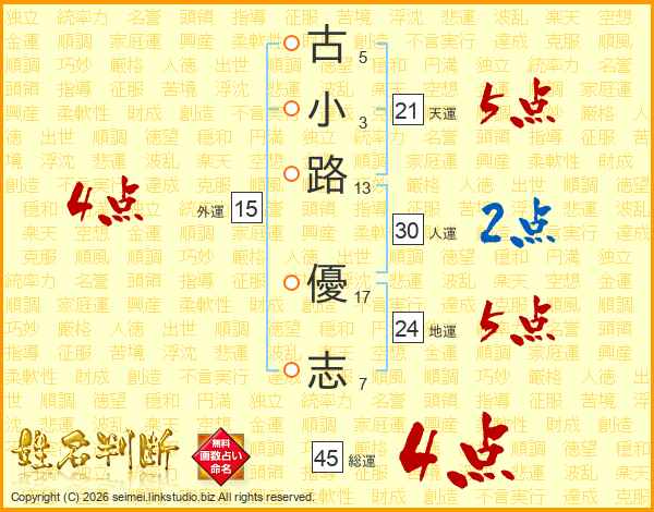 古(5画)小(3画)路(13画) 優(17画)志(7画)