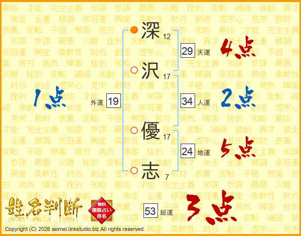 深(12画)沢(17画) 優(17画)志(7画)