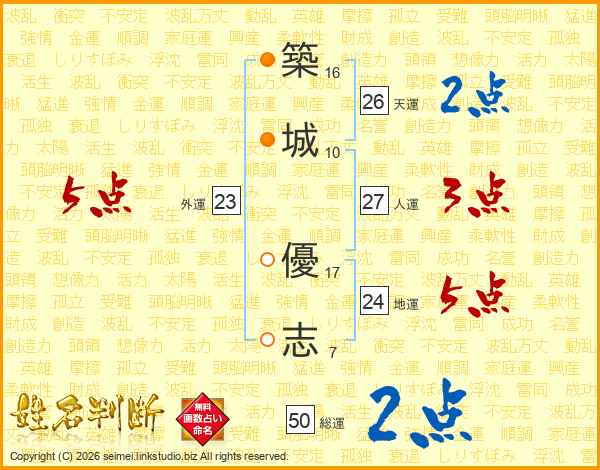 築(16画)城(10画) 優(17画)志(7画)