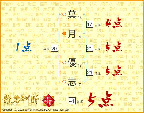 葉(13画)月(4画) 優(17画)志(7画)