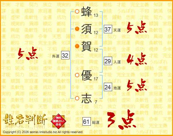 蜂(13画)須(12画)賀(12画) 優(17画)志(7画)