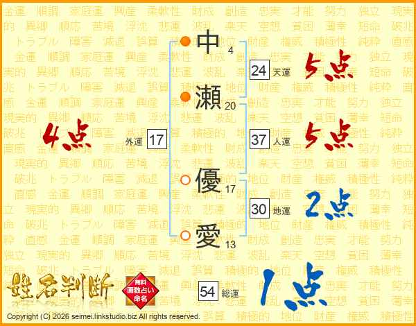 中(4画)瀬(20画) 優(17画)愛(13画)