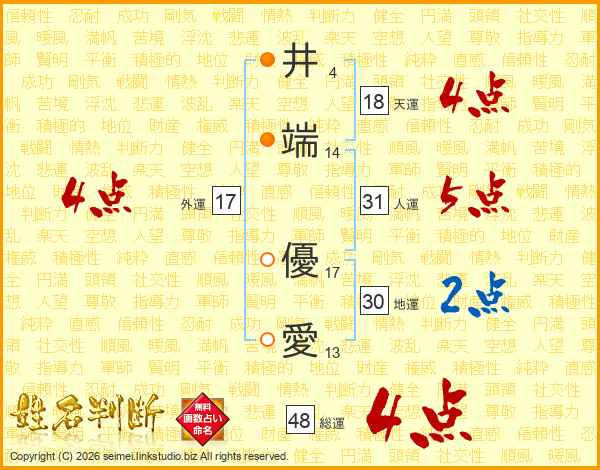 あなたの人生を表す1番重要な運勢です。生涯を通じて影響する総合運となり、主に50歳以降の晩年期に影響を及ぼします。苗字と名前の合計画数。