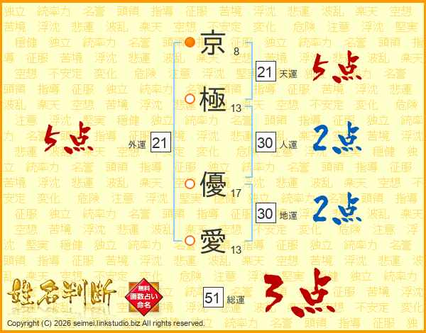 あなたの人生を表す1番重要な運勢です。生涯を通じて影響する総合運となり、主に50歳以降の晩年期に影響を及ぼします。苗字と名前の合計画数。
