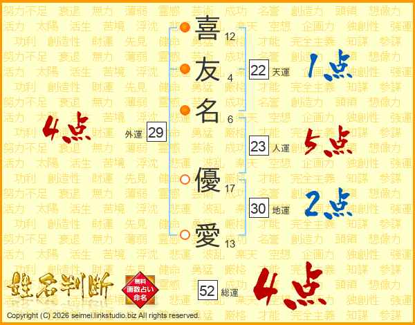 喜(12画)友(4画)名(6画) 優(17画)愛(13画)
