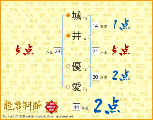 生活面を象徴する運勢です。外部から受ける影響力を表し、結婚運、家庭運や職場、環境への順応性を表します。総運から人運を引いた画数。姓や名が1文字の場合を除く。