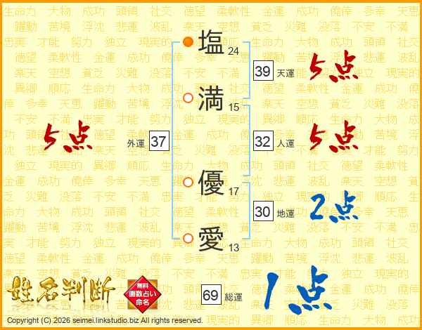 塩(24画)満(15画) 優(17画)愛(13画)