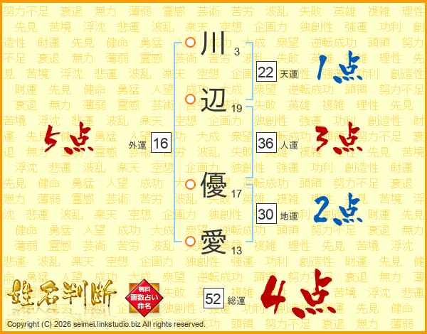 生活面を象徴する運勢です。外部から受ける影響力を表し、結婚運、家庭運や職場、環境への順応性を表します。総運から人運を引いた画数。姓や名が1文字の場合を除く。