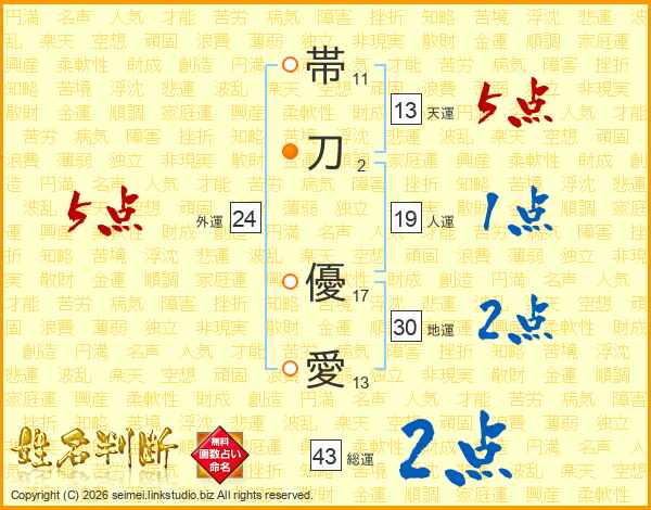 帯(11画)刀(2画) 優(17画)愛(13画)