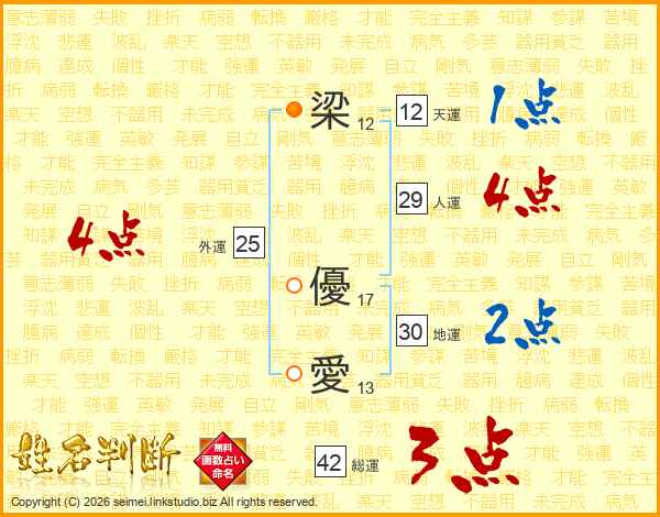 梁(12画) 優(17画)愛(13画)