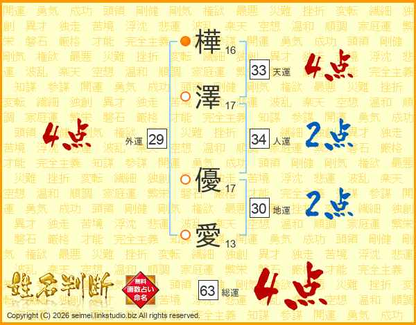 樺澤優愛さんの天運は33画の4点!