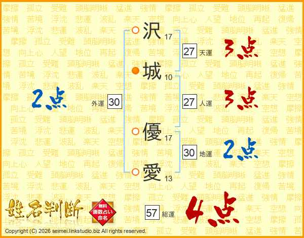 沢(17画)城(10画) 優(17画)愛(13画)