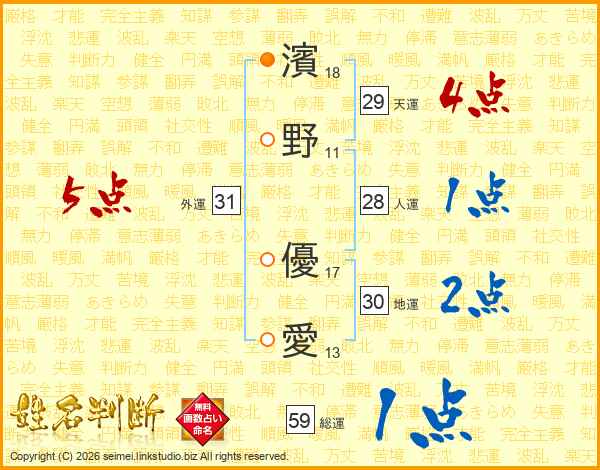 濱(18画)野(11画) 優(17画)愛(13画)
