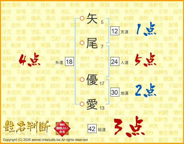 矢(5画)尾(7画) 優(17画)愛(13画)
