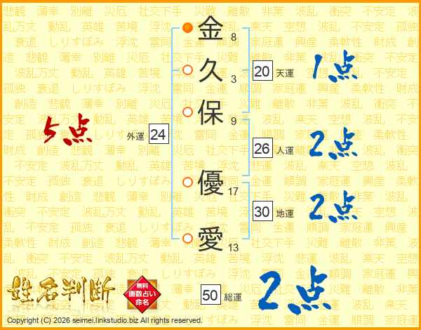 金(8画)久(3画)保(9画) 優(17画)愛(13画)