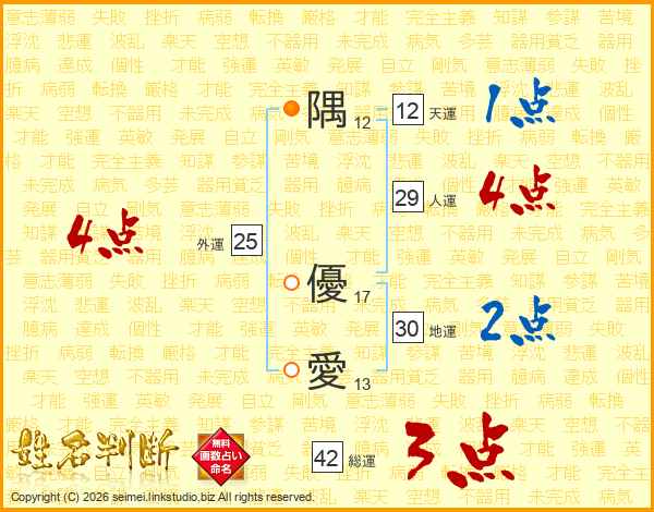 生活面を象徴する運勢です。外部から受ける影響力を表し、結婚運、家庭運や職場、環境への順応性を表します。総運から人運を引いた画数。姓や名が1文字の場合を除く。