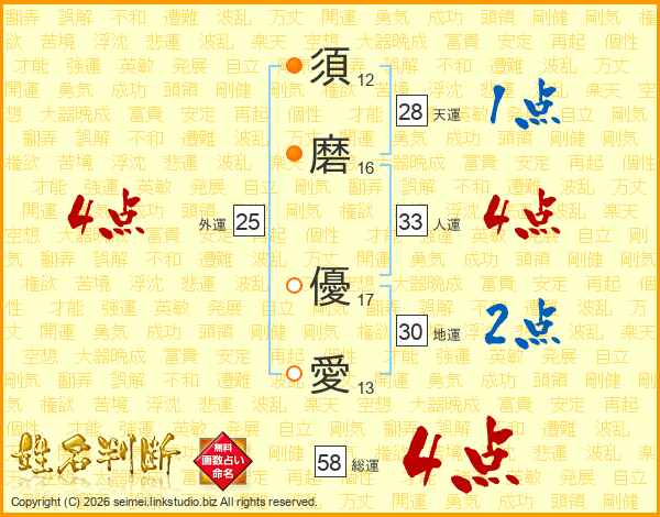 生活面を象徴する運勢です。外部から受ける影響力を表し、結婚運、家庭運や職場、環境への順応性を表します。総運から人運を引いた画数。姓や名が1文字の場合を除く。