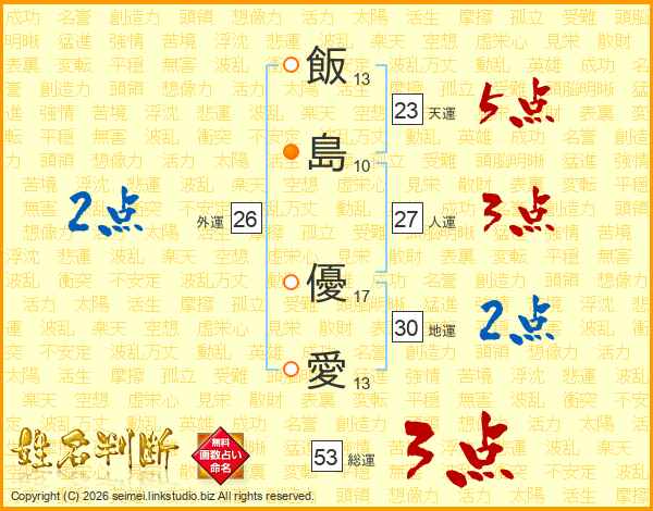 飯(13画)島(10画) 優(17画)愛(13画)