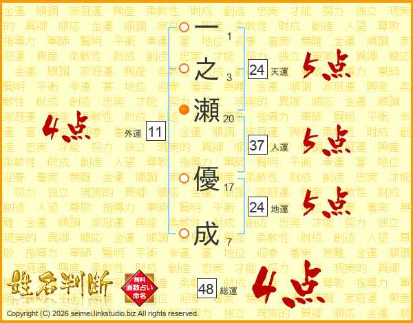一(1画)之(3画)瀬(20画) 優(17画)成(7画)