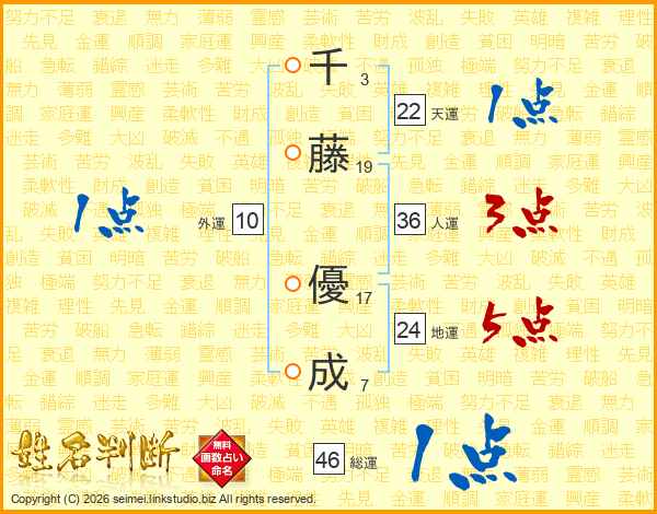 千(3画)藤(19画) 優(17画)成(7画)