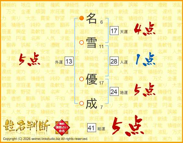名(6画)雪(11画) 優(17画)成(7画)