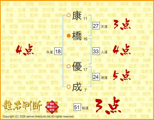 あなたの人生を表す1番重要な運勢です。生涯を通じて影響する総合運となり、主に50歳以降の晩年期に影響を及ぼします。苗字と名前の合計画数。
