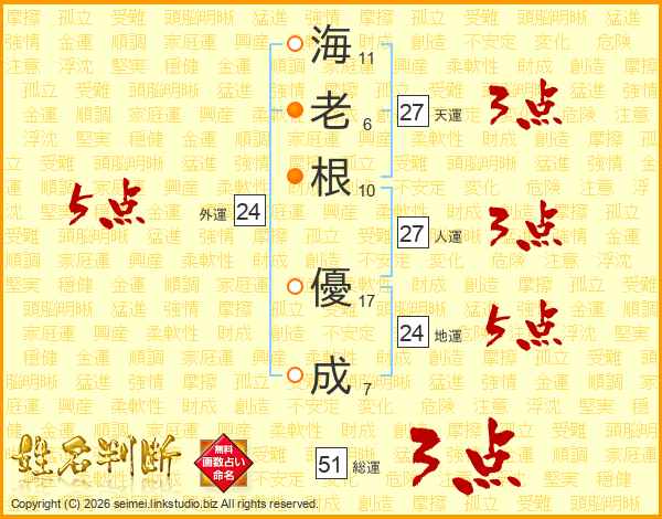海(11画)老(6画)根(10画) 優(17画)成(7画)