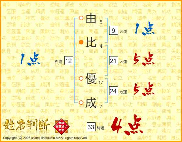 生活面を象徴する運勢です。外部から受ける影響力を表し、結婚運、家庭運や職場、環境への順応性を表します。総運から人運を引いた画数。姓や名が1文字の場合を除く。