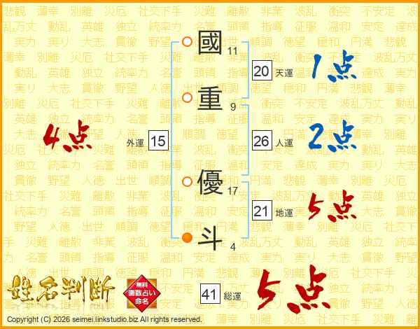 あなたの人生を表す1番重要な運勢です。生涯を通じて影響する総合運となり、主に50歳以降の晩年期に影響を及ぼします。苗字と名前の合計画数。