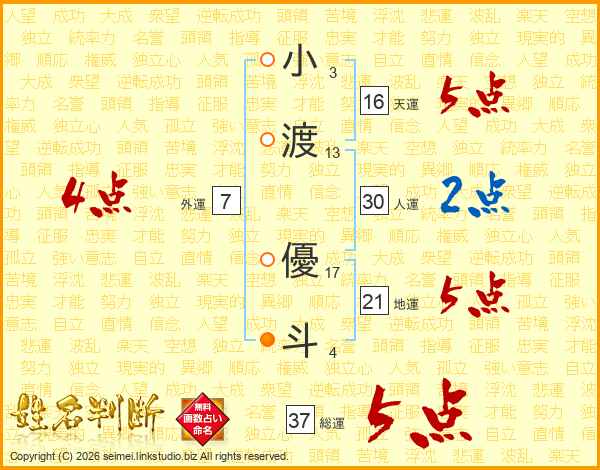 生活面を象徴する運勢です。外部から受ける影響力を表し、結婚運、家庭運や職場、環境への順応性を表します。総運から人運を引いた画数。姓や名が1文字の場合を除く。