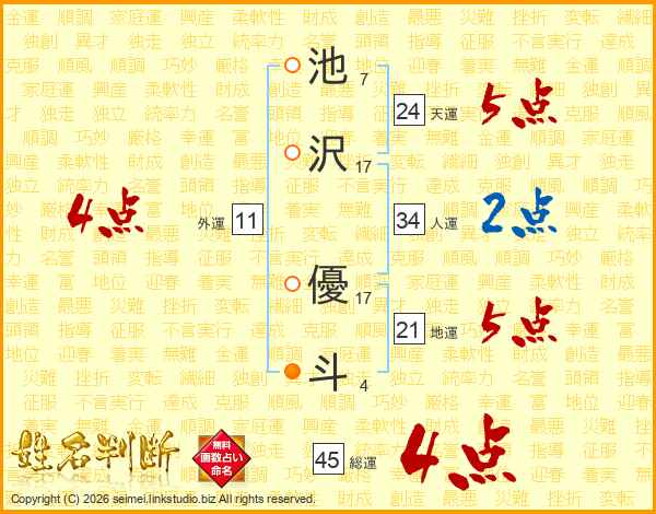 池(7画)沢(17画) 優(17画)斗(4画)