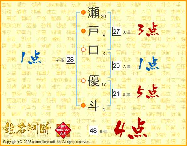 瀬(20画)戸(4画)口(3画) 優(17画)斗(4画)