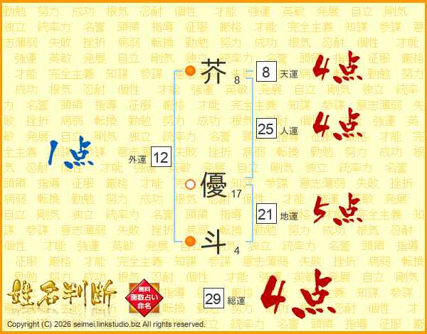 芥(8画) 優(17画)斗(4画)