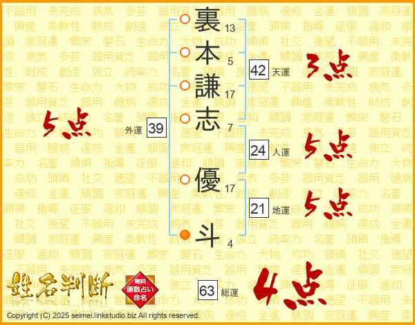 裏(13画)本(5画)謙(17画)志(7画) 優(17画)斗(4画)