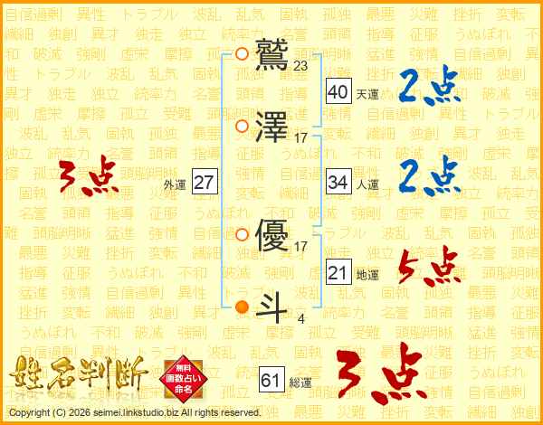 鷲(23画)澤(17画) 優(17画)斗(4画)