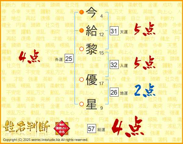 今(4画)給(12画)黎(15画) 優(17画)星(9画)