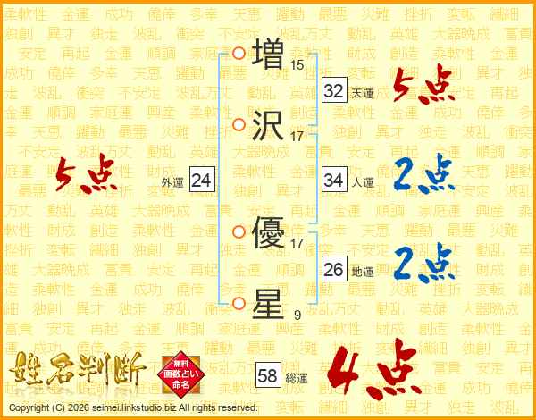 増(15画)沢(17画) 優(17画)星(9画)