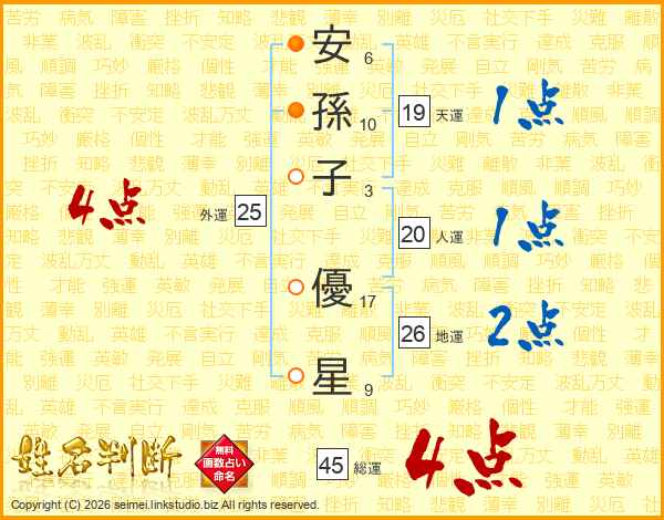 安(6画)孫(10画)子(3画) 優(17画)星(9画)