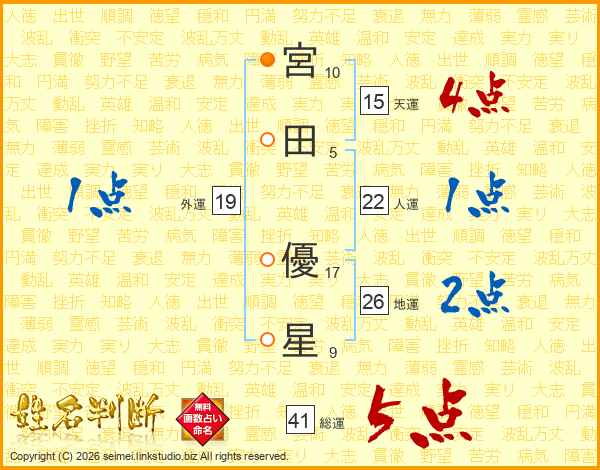 宮(10画)田(5画) 優(17画)星(9画)