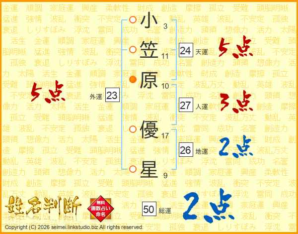 小(3画)笠(11画)原(10画) 優(17画)星(9画)