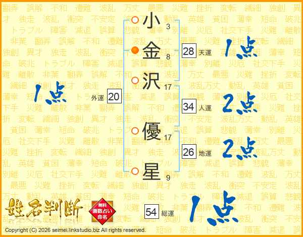 小(3画)金(8画)沢(17画) 優(17画)星(9画)