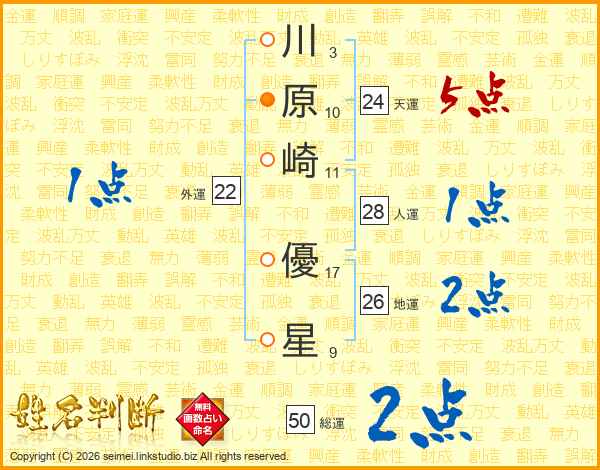 川(3画)原(10画)崎(11画) 優(17画)星(9画)