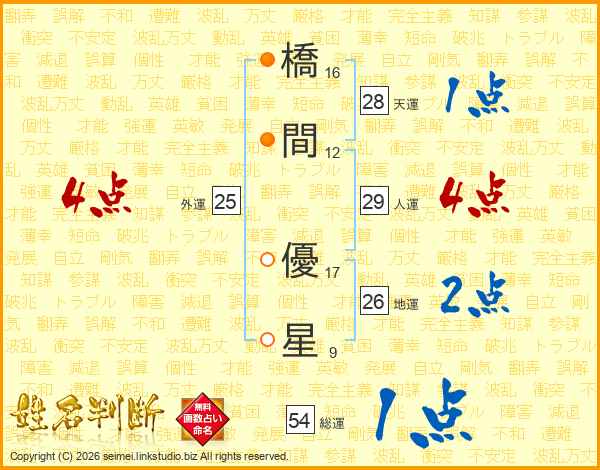 生活面を象徴する運勢です。外部から受ける影響力を表し、結婚運、家庭運や職場、環境への順応性を表します。総運から人運を引いた画数。姓や名が1文字の場合を除く。