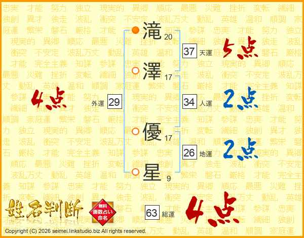 滝(20画)澤(17画) 優(17画)星(9画)