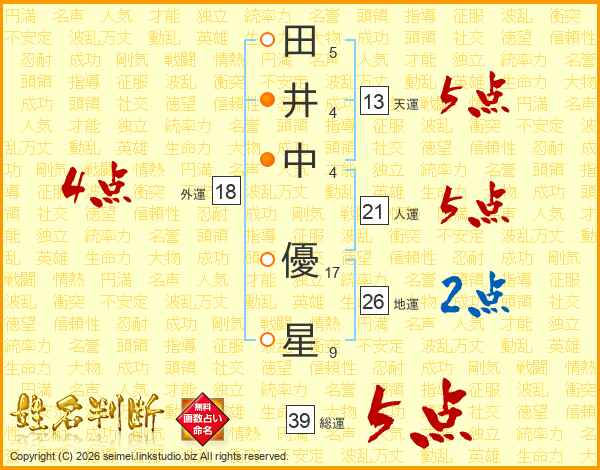 田(5画)井(4画)中(4画) 優(17画)星(9画)