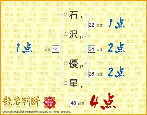 生活面を象徴する運勢です。外部から受ける影響力を表し、結婚運、家庭運や職場、環境への順応性を表します。総運から人運を引いた画数。姓や名が1文字の場合を除く。