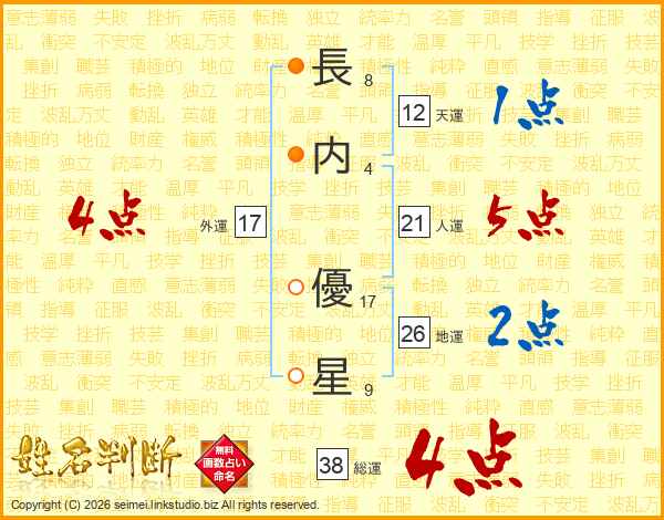 長(8画)内(4画) 優(17画)星(9画)