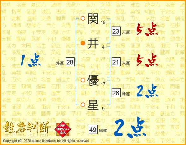 関(19画)井(4画) 優(17画)星(9画)