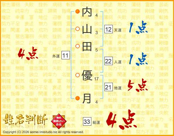 内(4画)山(3画)田(5画) 優(17画)月(4画)